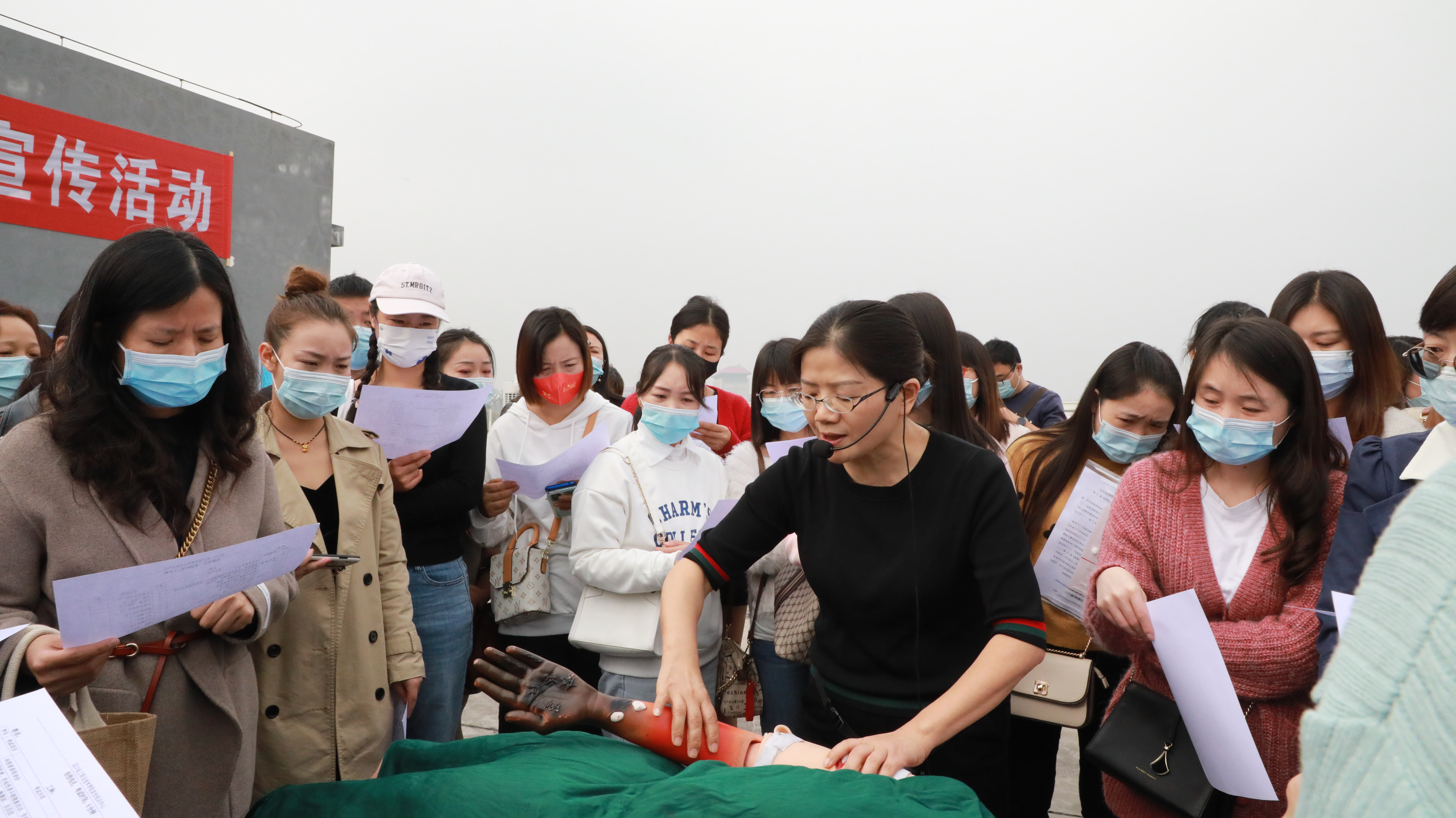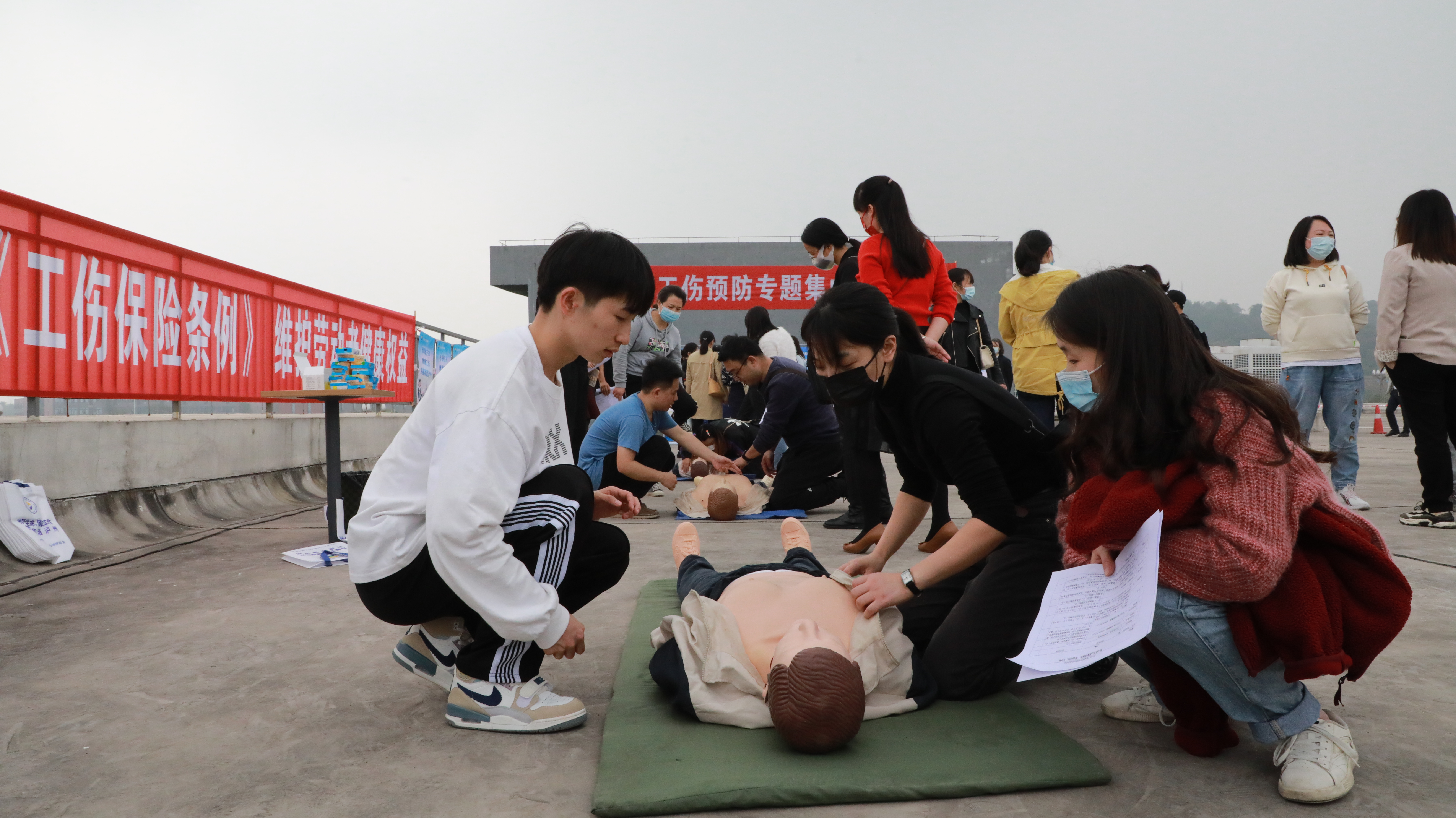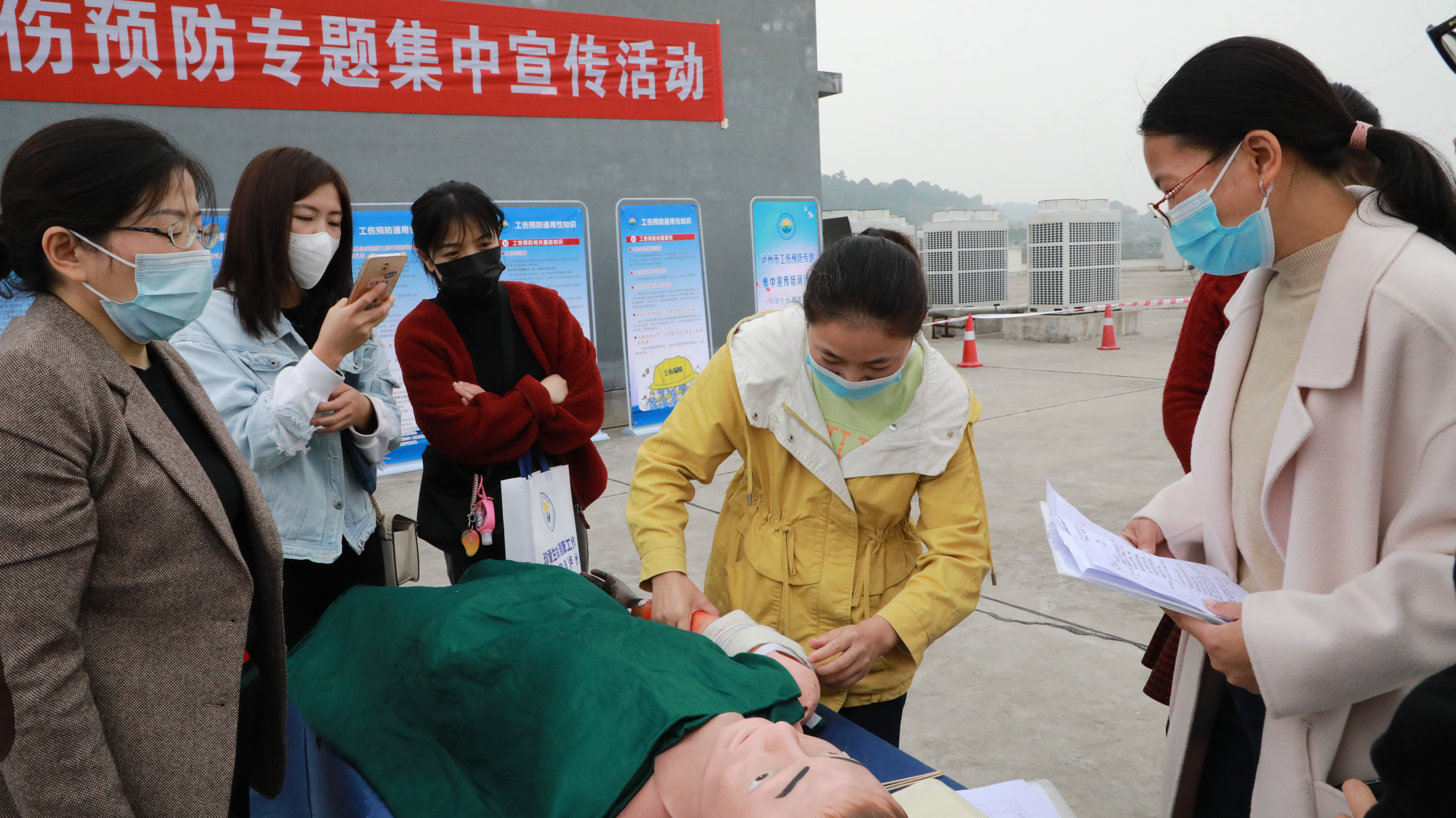 企业人员聆听了工伤保险政策宣讲,观看了工伤预防宣教体验车带来的创伤包扎、心肺复苏、VR体验等项目的讲解示范;接着企业人员结合自身需求,参与到各个项目的体验中。在创伤包扎体验区,企业人员在宣教人员的指导下按照包扎技术操作流程开展创伤包扎实操,并适时对核心操作要点进行讲解和指导;在心肺复苏体验区,企业人员从心肺复苏按压部位、按压频率、按压次数和按压深度等进行了充分体验,宣教人员就其动作正确性、规范性等进行了指导和协助;在VR“沉浸式”体验区,企业人员戴上VR眼镜,“身临”火灾现场、地震现场、高空坠落现场,在宣教人员的协助下通过操作手柄等,完成了火灾现场逃生、地震现场逃生、高处坠落事故体验等操作,身心受到了震撼和冲击,有效提升安全意识,收获工伤预防的知识和技能。