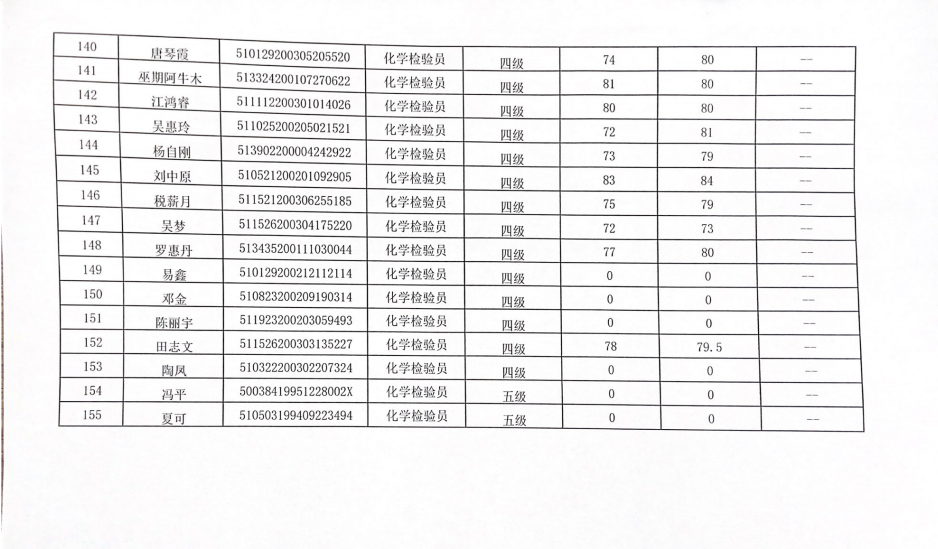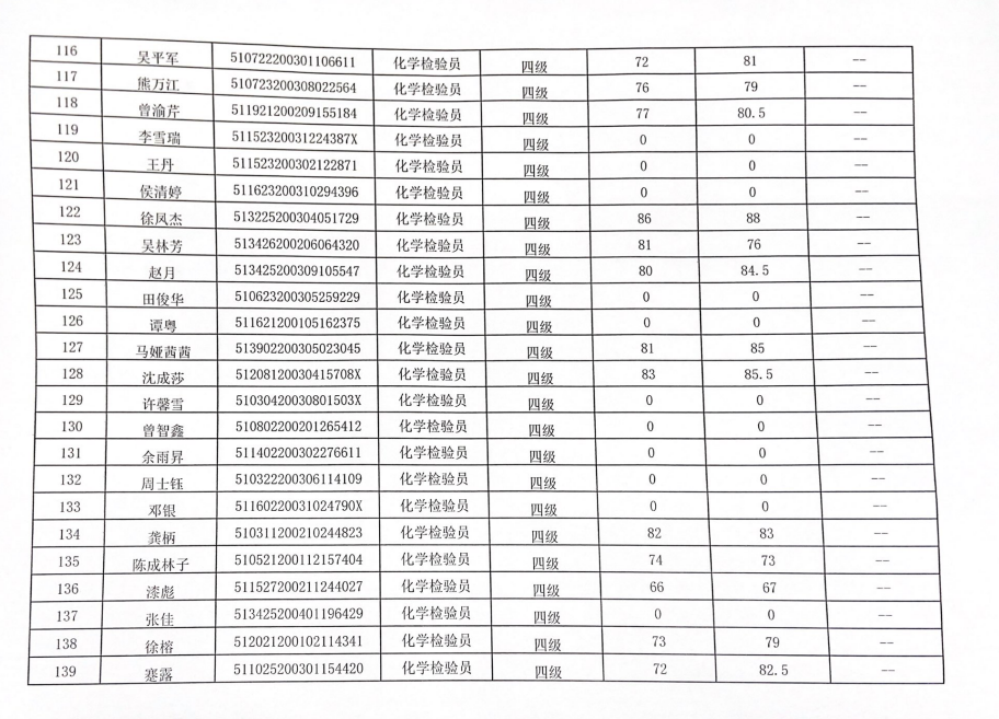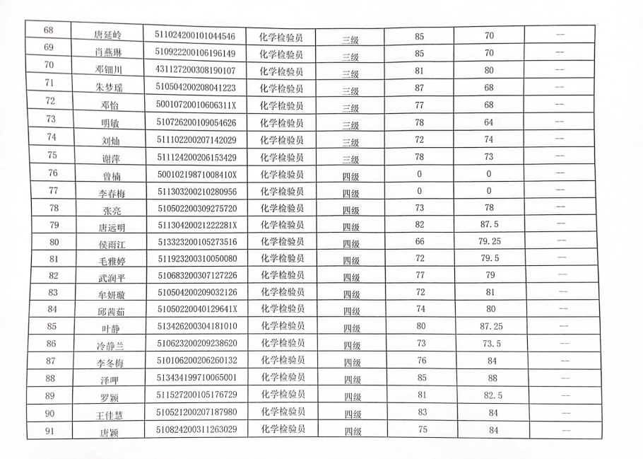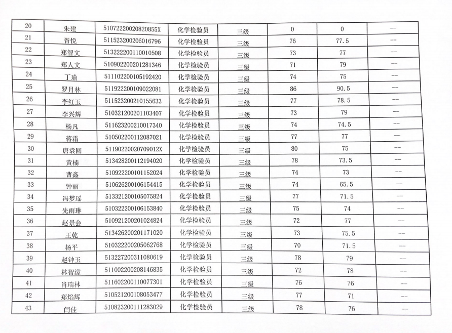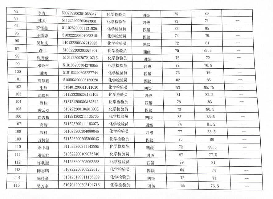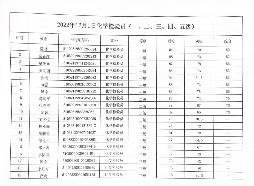 四川化工职业技术学院职业技能等级认定中心于2022年12月1日进行了化学检验员(1、2、3、4、5级)职业技能等级认定,现将本次成绩公示如下(见附件)。公示时间:2022年12月23日至2022年12月27日。