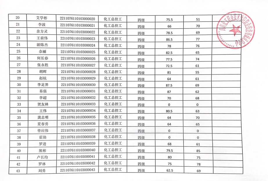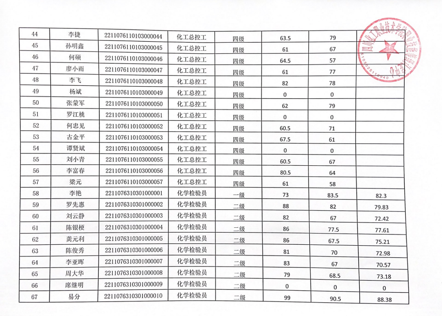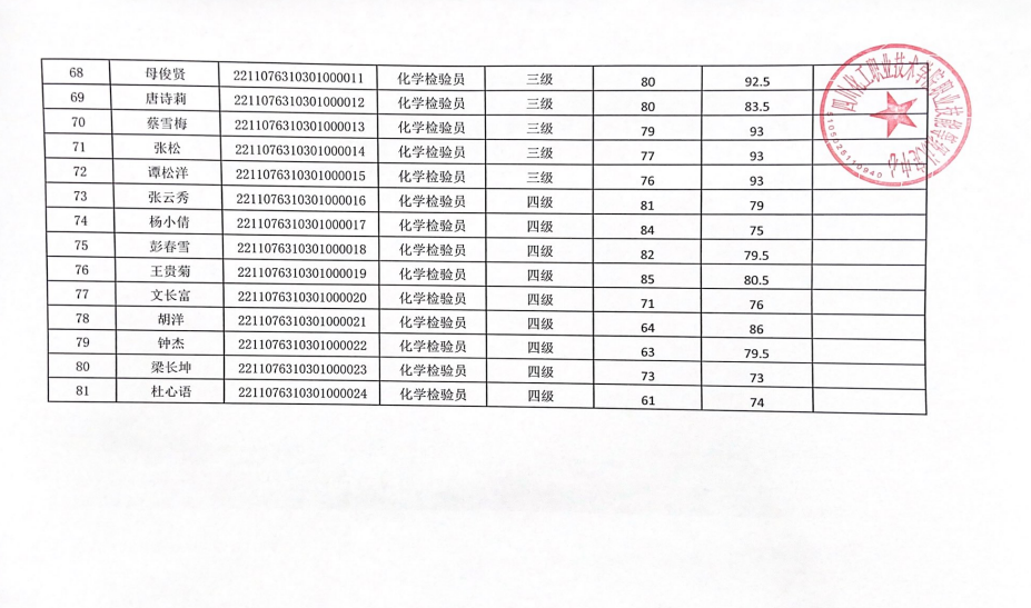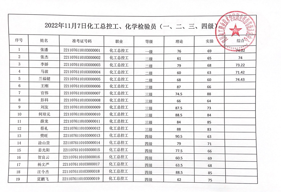 四川化工职业技术学院职业技能等级认定中心于2022年11月7日进行了化工总控工(1、2、3、4级)、化学检验员(1、2、3、4级)职业技能等级认定,现将本次成绩公示如下(见附件)。公示时间:2022年11月26日至2022年11月30日。