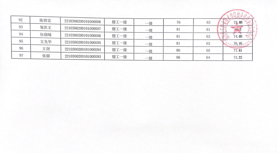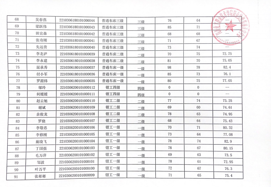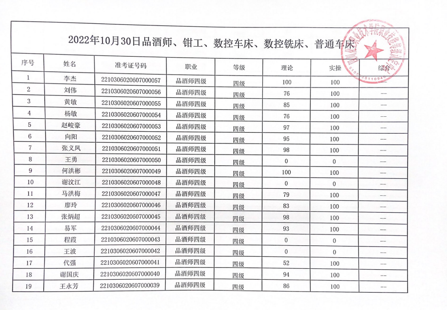 四川化工职业技术学院职业技能等级认定中心于2022年10月30日进行了品酒师(1、2、3、4级)、钳工(1、2、4级)、数控车床(2、3、4级)、数控铣床(1、4级)、普通车床(1、2、3级)职业技能等级认定,现将本次成绩公示如下(见附件)。公示时间:2022年11月16日至2022年11月20日。