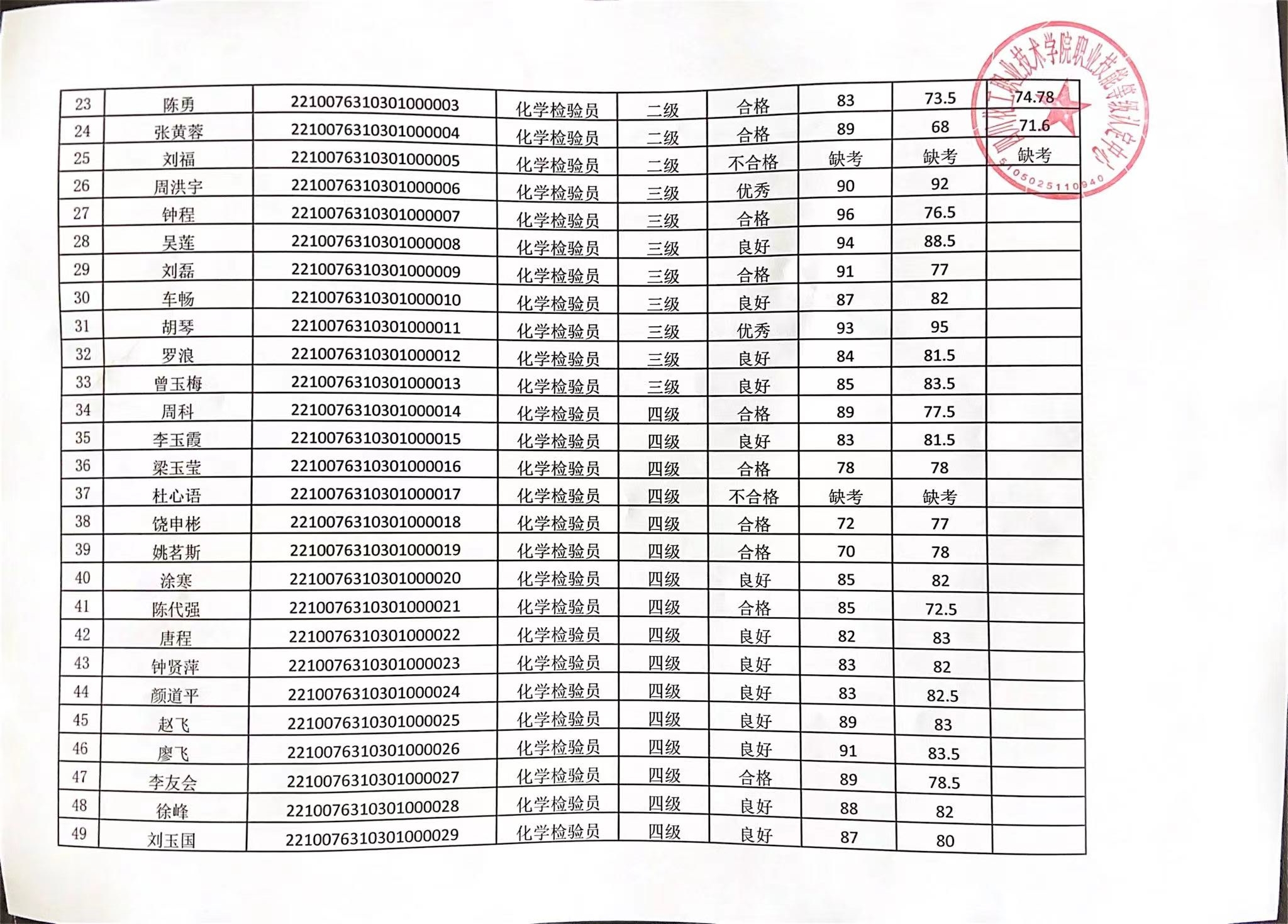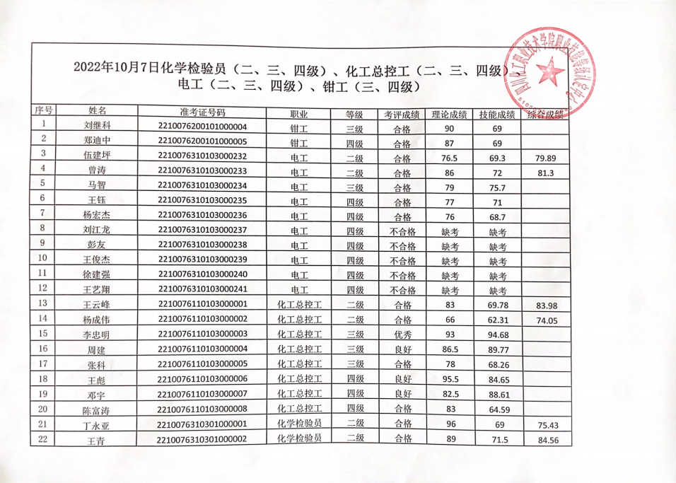 四川化工职业技术学院职业技能等级认定中心于2022年10月7日进行了化学检验员(2、3、4级)、化工总控工(2、3、4级)、电工(2、3、4级)、钳工(3、4级)职业技能等级认定,现将本次成绩公示如下(见附件1、2、3)。公示时间:2022年10月26日至2022年10月30日。